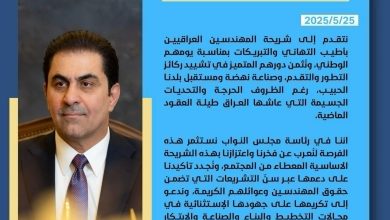 نتقدم إلى شريحة المهندسين العراقيين بأطيب التهاني والتبريكات بمناسبة يومهم الوطني، ونُثمن دورهم المتميز في تشييد ركائز التطور والتقدم، وصناعة نهضة ومستقبل بلدنا الحبيب