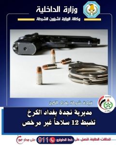 مديرية نجدة بغداد الكرخ تضبط 12 سلاحاً غير مرخص في إطار الجهود الأمنية المستمرة لتعزيز الأمن والاستقرار، تمكنت مفارز مديرية نجدة بغداد الكرخ من ضبط (12) سلاحاً غير مرخص خلال الـ24 ساعة الماضية.