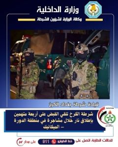 شرطة الكرخ تلقي القبض على أربعة متهمين بإطلاق نار خلال مشاجرة في منطقة الدورة – الميكانيك