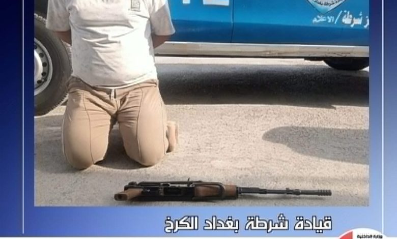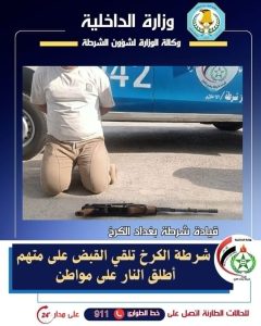 شرطة الكرخ تلقي القبض على متهم أطلق النار على مواطن … اعلام شرطة الكرخ تمكنت مفارز مركز شرطة الإعلام من القبض على متهم أقدم على إطلاق النار تجاه أحد المواطنين وجاءت العملية بعد ورود إخبار من قسم الاستجابة و السيطرة 911 بوجود مشاجرة وإطلاق عيارات نارية ضمن قاطع المسؤولية، على الفور وجه السيد قائد شرطة بغداد الكرخ اللواء الحقوقي عدنان حسن حمد ” فريق عمل من مركز شرطة الاعلام بالانتقال فوراً إلى محل الحادث، وبالفعل باشرت القوة بالتحرك نحو محل الحادث وتبين أن متهم قام بإطلاق النار من سطح داره على المواطن باستخدام بندقية نوع كلاشنكوف . وقد تمكن فريق العمل من القبض على المتهم وضبط السلاح المستخدم، وجاري اتخاذ الاجراءات القانونية بحقه وفق القانون