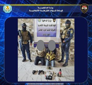 القبض على متهمين اثنين بقضايا الارهاب وضبط بحوزتهما كمية من مادة الكريستال المخدرة وادوات للتعاطي وأسلحة غير مرخصة في بغداد تمكّنت قوة من اللواء الخامس الفرقة الثانية شرطة اتحادية بالاشتراك مع قوة من خلية الخطف وبعد ورود معلومات عن وجود عصابة متهمة بالقتل، من القاء القبض على متهمين اثنين مطلوبين وفق احكام المادة (4 ارهاب)، في منطقة (ابو عظام)، وضبط بحوزتهما (320غم مادة الكريستال، 2 مسدس، 2 مخزن عتاد، ادوات للتعاطي، 2 دراجة نارية، مواد اخرى)، تم تسليمهما مع المضبوطات إلى الجهات المختصة.