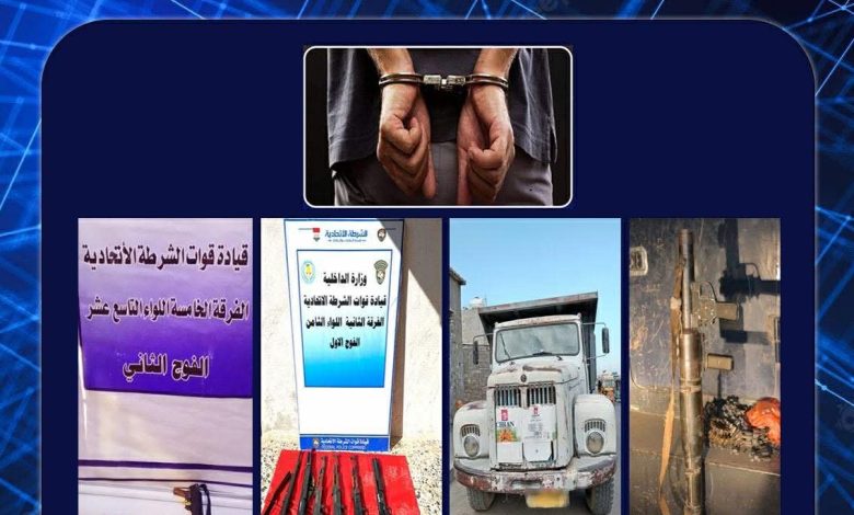 الفرقة الخامسة/ اللواء التاسع عشر / تنفيذ عملية تفتيش على الأسلحة غير المرخصة في منطقة (حي البساتين)، وضبط (بندقية كلاشنكوف، 2 مخزن عتاد، 35 اطلاقة). اللواء العشرون/ القبض على متهم مطلوب بجريمة الابتزاز شرق بغداد. اللواء العشرون/ ضبط عجلة مخالفة مع سائقها في منطقة (الحميدية) شرق بغداد. اللواء العشرون/ القبض على مخالفين اثنين يقومون بالبناء في الاراضي الزراعية بدون موافقات اصولية في منطقة (الردينية).