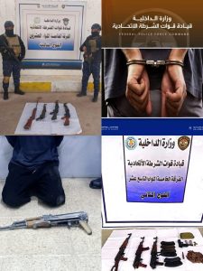 الشرطة الاتحادية تلقي القبض على 5 متهمين بقضايا قانونية وتضبط أسلحة غير مرخصة في بغداد وفق مذكرات قبض قضائية، وأثناء تنفيذ واجب التفتيش المناطقي ، ألقت قطعات الفرقة الخامسة شرطة اتحادية بإسناد الجهد الاستخباري القبض على 5 متهمين بقضايا ( التحرش، المخالفة) مع ضبط (7 بندقية كلاشنكوف، 2 مسدس نوع كولومبي، بندقية صيد، 6 مخزن عتاد بندقية مع 295 اطلاقة) شرق العاصمة، كما ساهمت بدعم مفارز بلدية الشعب في إزالة تجاوز على ارض زراعية . تم إحالة المتهمين مع المضبوطات اصولياً إلى الجهات المختصة.