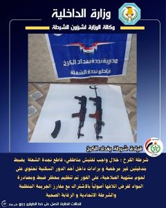 شرطة الكرخ : خلال واجب تفتيش مناطقي، قاطع نجدة الشعلة يضبط بندقيتين غير مرخصة و برادات داخل أحد الدور السكنية تحتوي على لحوم منتهية الصلاحية