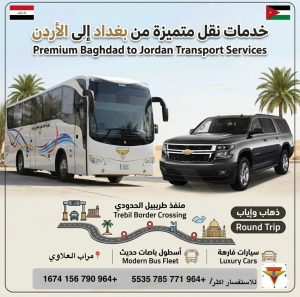 المسافرين والوفود تعلن تسيير رحلات النقل الدولي بين العراق والأردن تُعلن الشركة العامة لنقل المسافرين والوفود عن تسيير رحلات النقل الدولي بين جمهورية العراق والمملكة الأردنية الهاشمية، وفق التفاصيل الاتية: خط السير: من مكتب الشركة في منطقة العلاوي – بغداد إلى منفذ طريبيل الحدودي (الحدود العراقية – الأردنية) وسائط النقل: باصات نقل حديثة نوع VIP -سيارات حديثة نوع GMC لضمان الراحة والسرعة. مميزات الخدمة: راحة وأمان ، منتظمة ومستمرة ،فريق مهني متخصص. للحجز والاستفسار: يرجى مراجعة مكتب الشركة في العلاوي أو الاتصال على الرقم: