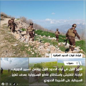 الفوج الأول في لواء الحدود الاول يواصل تسيير الدوريات الراجلة لتفتيش واستطلاع قاطع المسؤولية بهدف منع عمليات التسلل والتهريب وتعزيز السيطرة على الشريط الحدودي ضمن قاطع المسؤولیة.